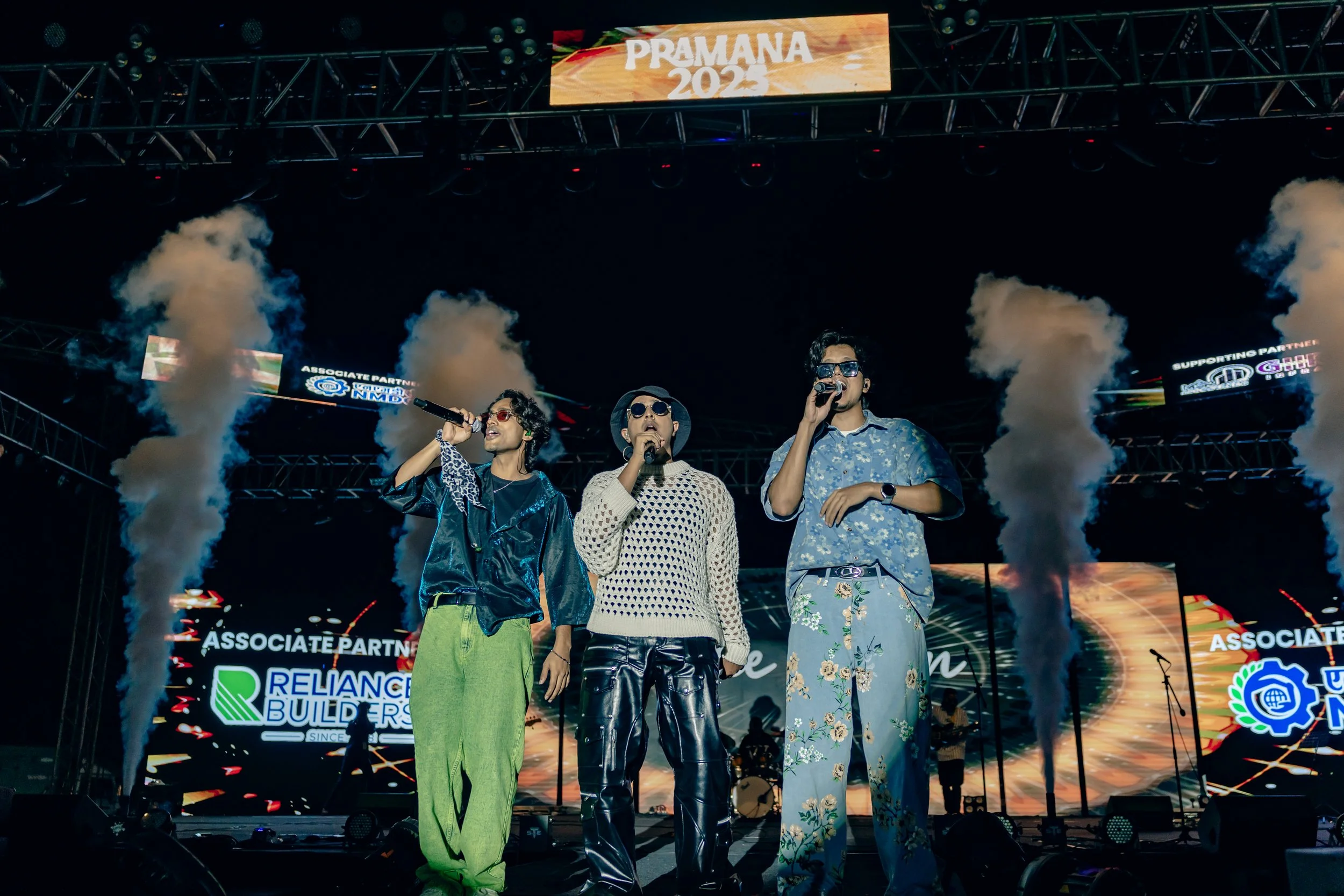 Three performers on stage singing into microphones at an event called PRAMANA 2023. The stage is decorated with smoke effects and large digital screens displaying the event name and sponsor logos. View fullsize