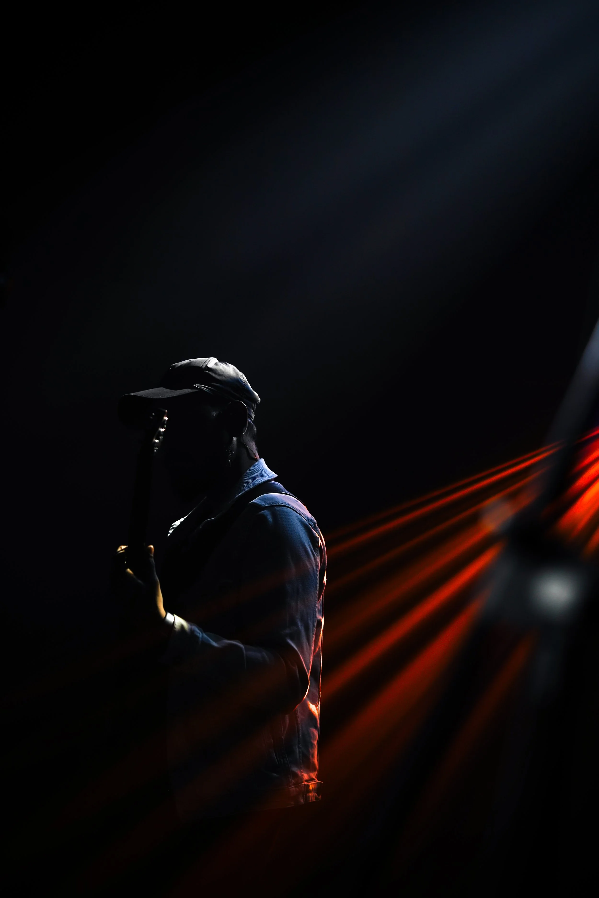 A person wearing a cap and a jacket, holding a guitar, is silhouetted against a dark background with red light streaks. View fullsize