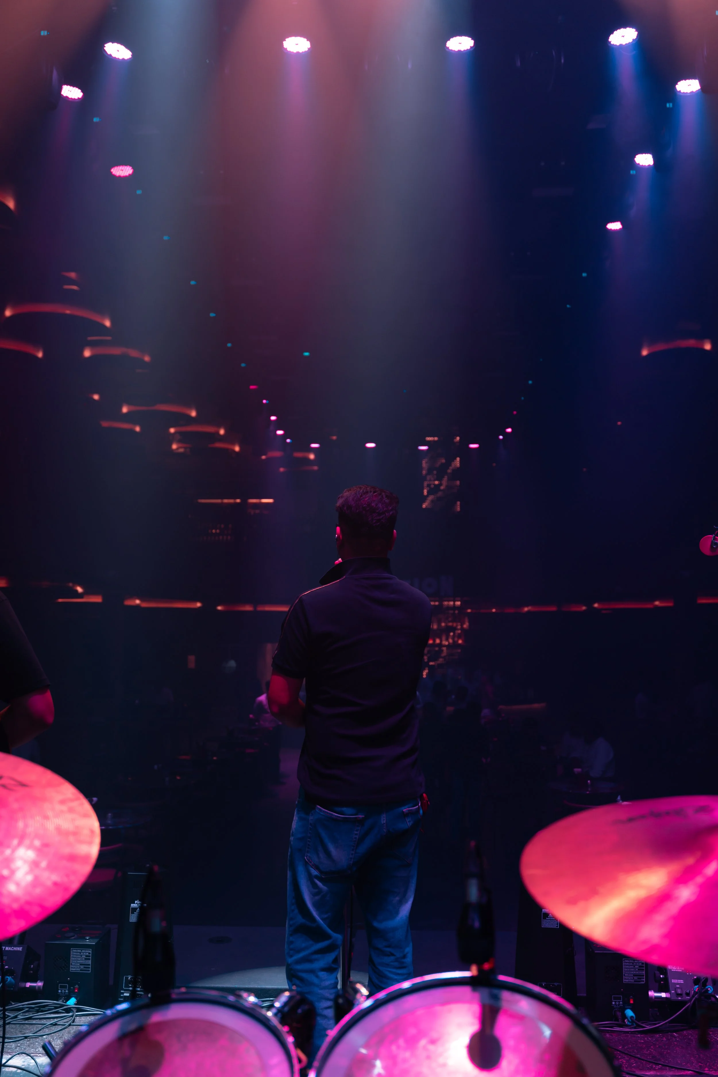 A person standing with their back to the camera on a stage, overlooking a vibrant nightclub or concert venue with colorful lights and a large, dark space in front. View fullsize