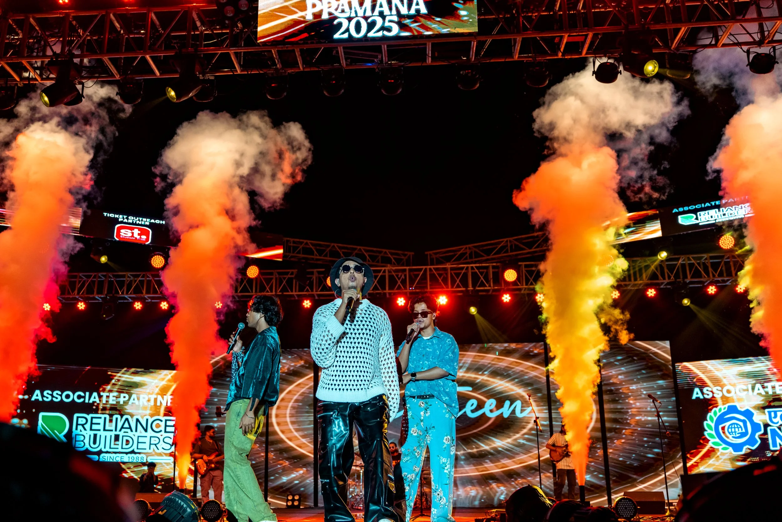 A live stage performance with three singers holding microphones, colorful lights, fog effects, and smoke cannons, with digital screens displaying event information at PRAMANA 2025. View fullsize