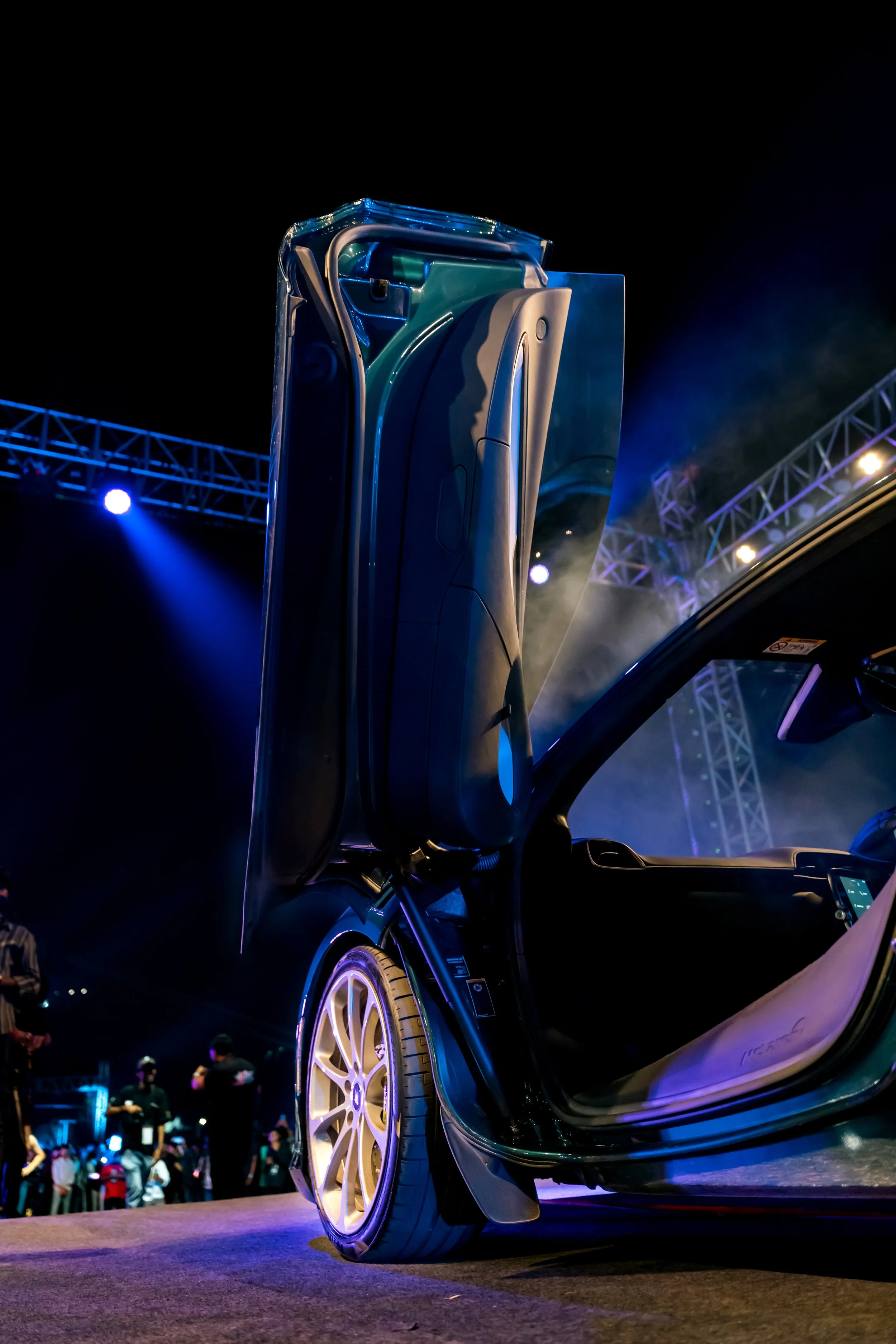 Close-up of a futuristic sports car with gull-wing doors open, showing the interior and a large wheel, at night with blue and purple lighting and a crowd in the background.